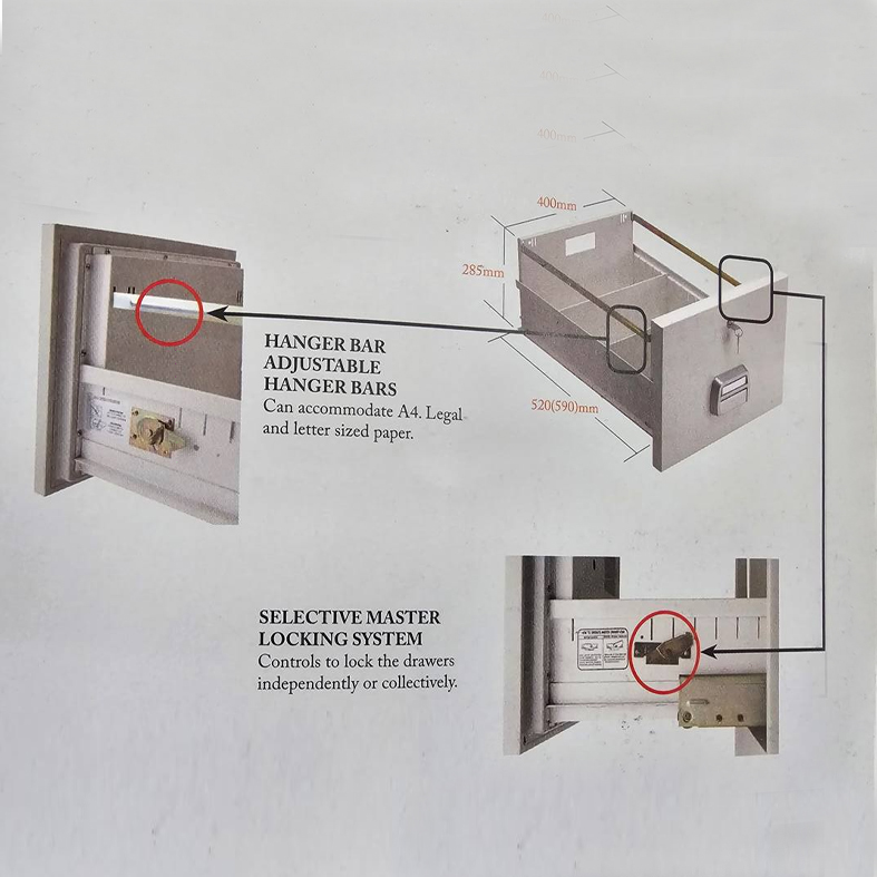 أدراج معدنية قياسية مقسمة لحفظ المصنفات الإدارية والملفات الورقية بطريقة منظمة.